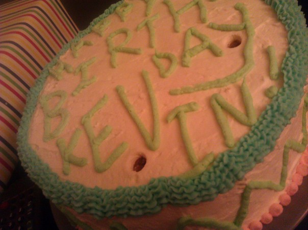 A Birthday cake with pink and blue frosting with amateur writing on top.