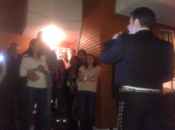 Several people, standing inside a building, watch as a dark haired man speaks into a microphone, possibly singing.