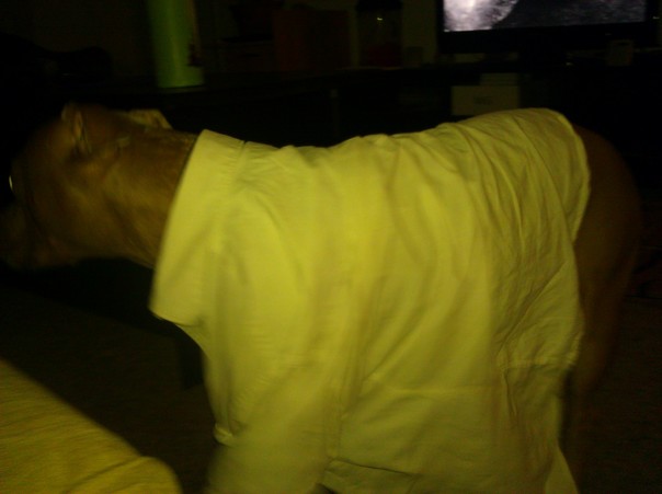 A large brown dog wearing a large yellow oxford style shirt.