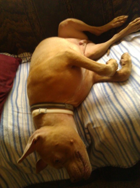 Brown pitbull sleeping on his back on top of a blue and white striped blanket.