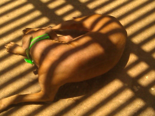 A brown dog with a bright green collar sleeping on a sunny patio.