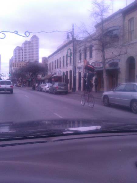 Seasonal decorations line the street as a cyclist rides by in a very high bike.