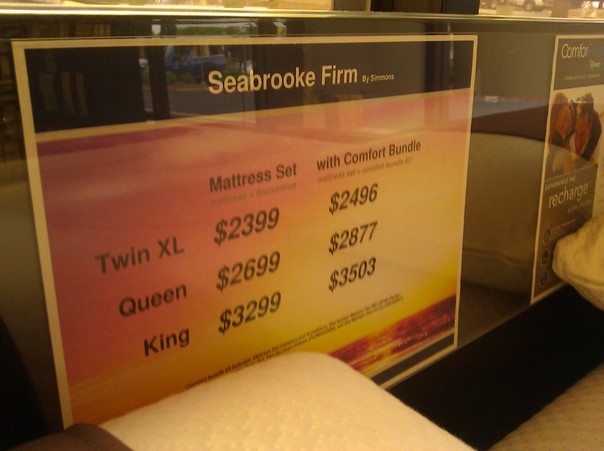 THIS COLORFUL AND DRAMATIC SIGN DRAWS YOUR ATTENTION TO THE VARIETY OF MATTRESSES BEING SOLD IN THIS MATTRESS STORE.