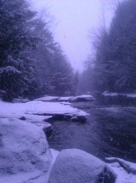 In a cold, winter forest, snow is falling on the pond.