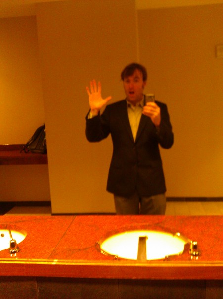 A man in very formal attire, taken a goofy photo with his hand up for a mirror selfie.