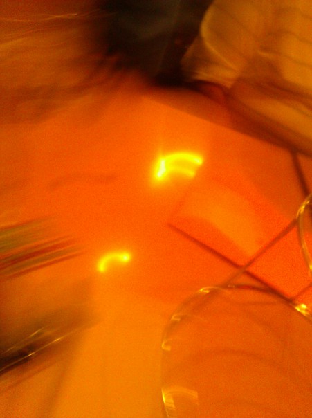 A blurry image filled with orange and yellow lights and what appears to be seated individual wearing a stripped white shirt.