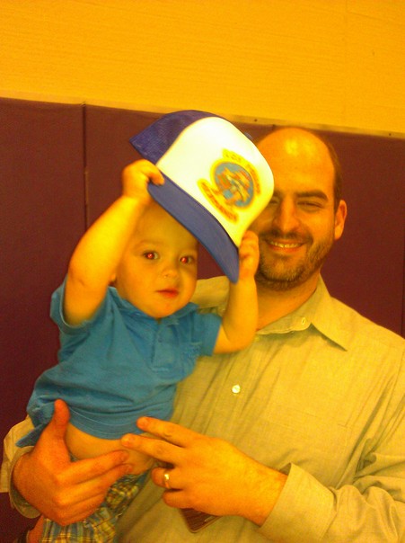 This is a picture of a married man in a tan shirt holding a baby in a blue shirt,and the baby is holding the man's hat.