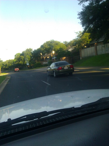 two cars driving in the right hand lane taken from the driver of a car driving in the left hand land.