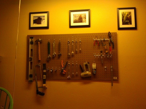 The peg and hook board is neatly arranged with many different tools.