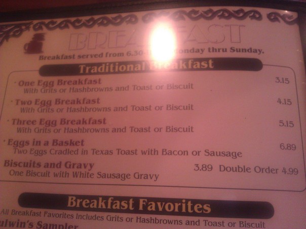 A laminated breakfast menu of items available at an inexpensive restaurant.