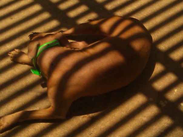 A tan dog with a neon green collar lies in the shadow of window blinds taking in the warm sunshne.