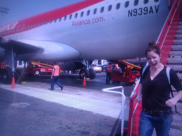 The excited young lady is exiting the outdoor stairway from the airplane.
