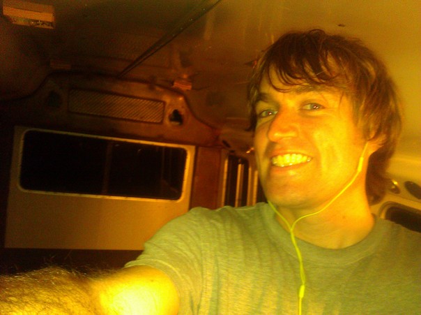 Brunette main in a green t-shirt wearing earphones and smiling while taking a self portrait.