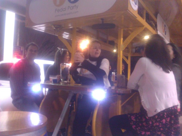 Several women and one male are at a bar onboard a mobile party platform.