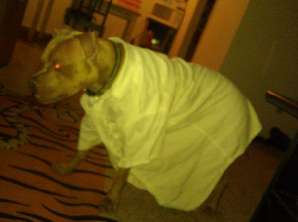Dog wearing clothes looking beautiful and good.