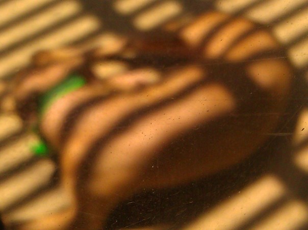 The shadows of blinds fall upon this brown dog sleeping on the floor.