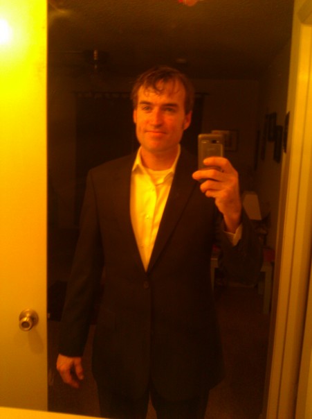 A man dressed up taking a picture of himself in the mirror with his phone.