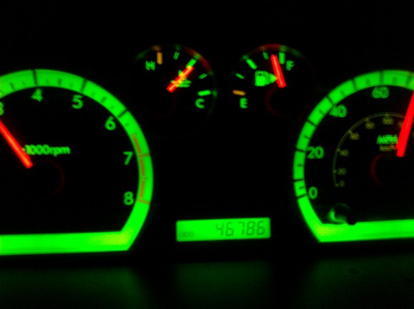 The red and green backlit guages on a car's dashboard show that the car is moving very quickly.