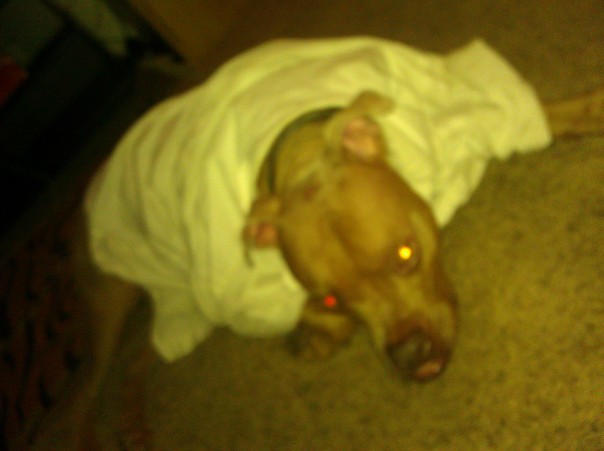 A GREY PIT BULL IS WEARING A WHITE T-SHIRT AND LAYING ON THE FLOOR.
