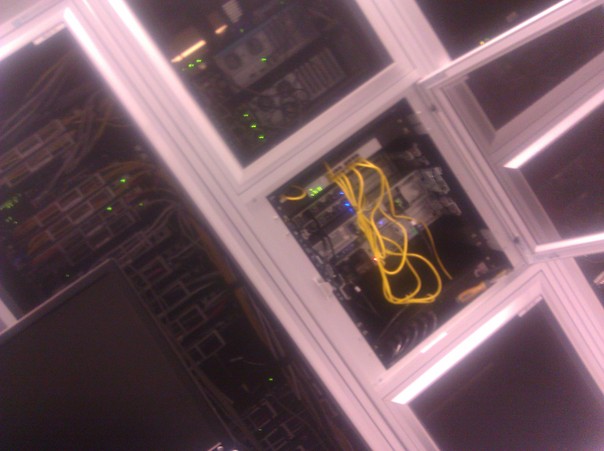 A server rack behind a white door, with a bunch of yellow cables coming from one of the rack-mounted units.