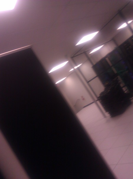 An out of focus and on angle shot of an empty office building with florescent lighting.