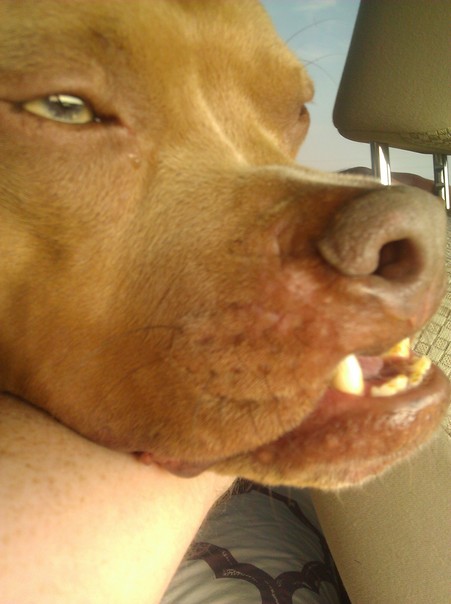 Brown, pit-bull mix with under bite and beautiful green eyes appears to be on a car ride.
