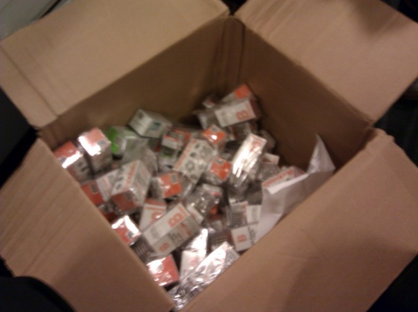 This is a cardboard box that has a bunch of smaller boxes inside. The smaller ones are wrapped in clear plastic.