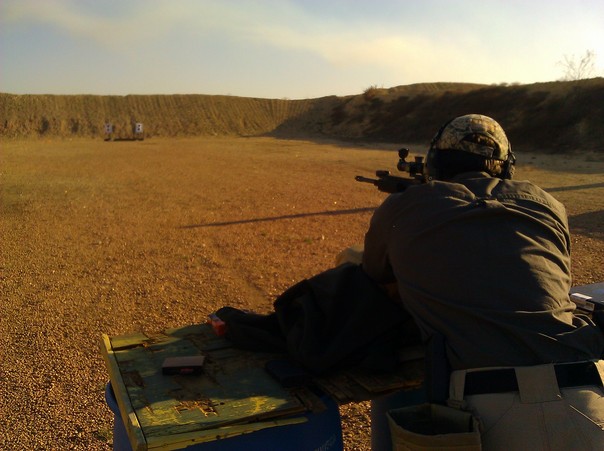 The soldier aims at the target while in a barricaded area for safety.