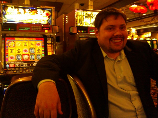 The large mustached man is laughing in front of the slot machines.