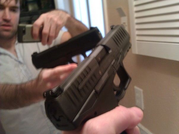 The gun is black and the man holding it is a lonely Caucasian man taking a picture in order to receive attention.