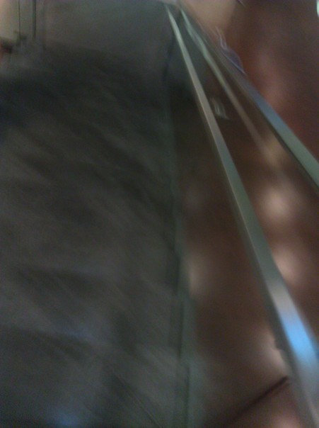 A shiny silver handrail is running along side a staircase that is in a low lit area.