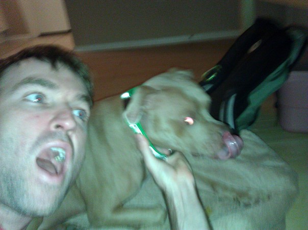 This is a young Caucasian male holding the green collar of a smooth coat red dog who has his tongue out.