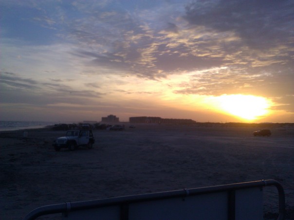The beach is deserted except for two faraway cars illuminated by the sunset.