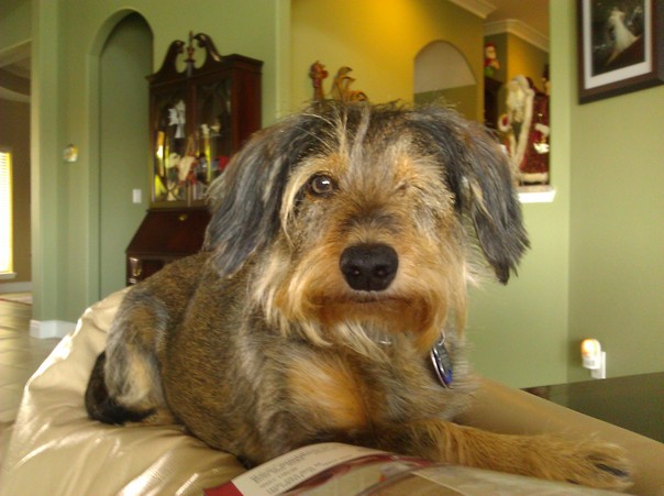 a shaggy dog with only one eye looking at the camera.