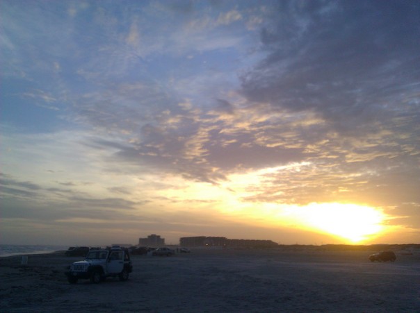 This is a sunset at the beach and there are cars parked on the sand. The closest one is a jeep.
