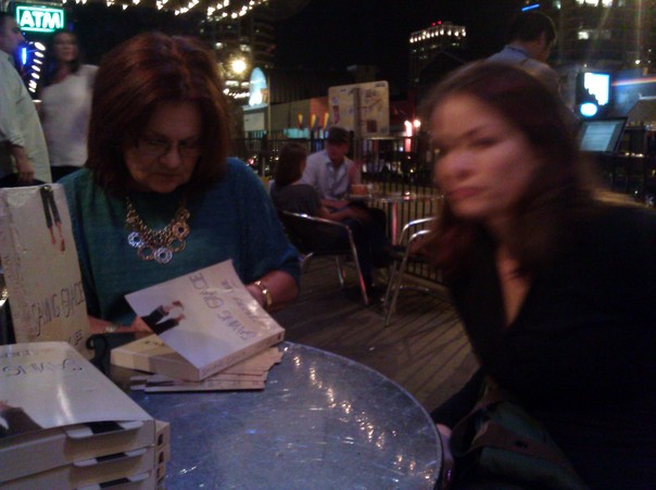 This is a blurry photo of two women sitting at a glass topped table with stacks of books on it.