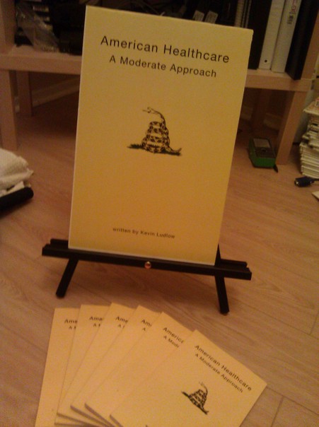 Pamphlets that have information on American healthcare rest on a table, with one displayed above them on a small easel.