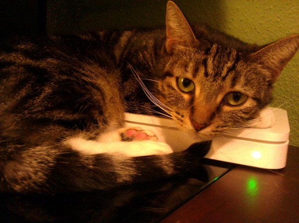 Perfectly poised cat snuggling what looks to be a telephone atop a beautiful stained table.