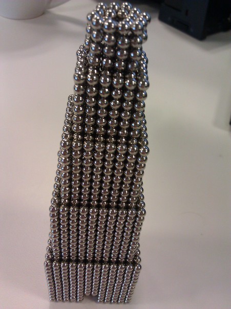Looking down on a stack of shiny metal balls arranged to resemble a skyscraper.
