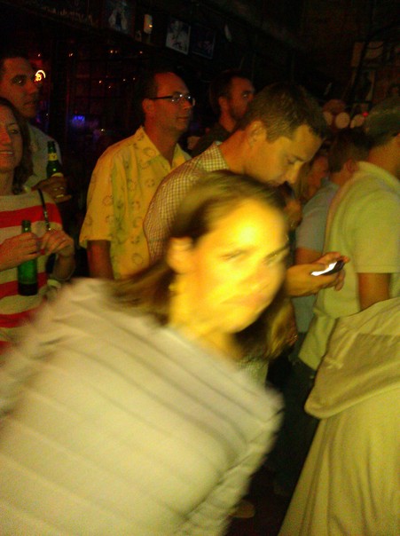 A blurry shot of a bar photo bomb, with a guy messing around on his phone in the background.