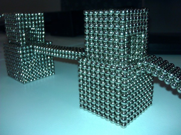 A picture of magnetic silver balls in the shape of a bridge.