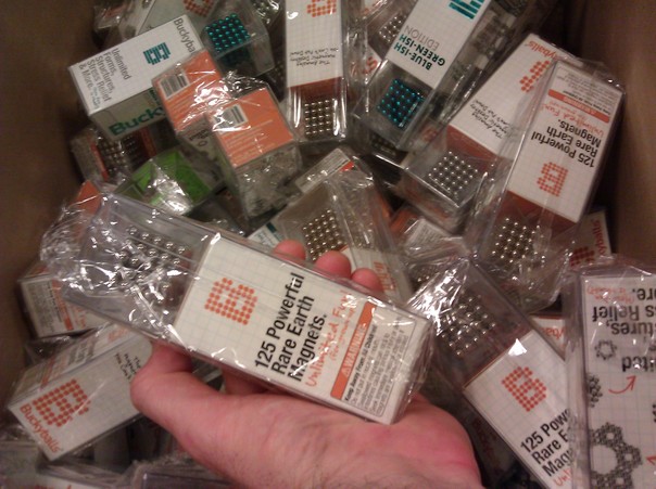 This is a bin full of packages of 125 powerful rare earth magnets.