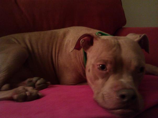 A dog with a green collar is resting peacefully on a cushioned chair.
