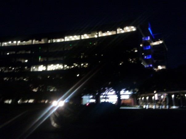 This twilight view depicts a large, well-lit building surrounded by trees.
