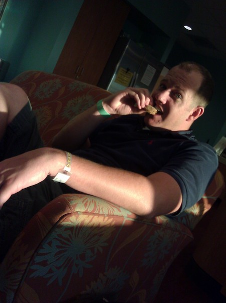 A man tasting a sweet in his mouth with wrist band in right hand and a watch in left hand