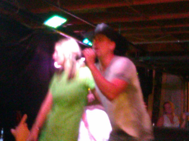 A man in a white shirt and black cowboy hat sings into a microphone near a woman in a green dress.