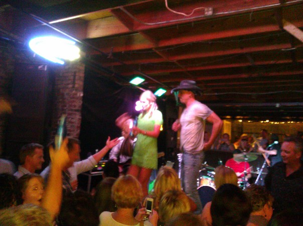 A man in the crowd holds out his hand to the female member of the band that is onstage.