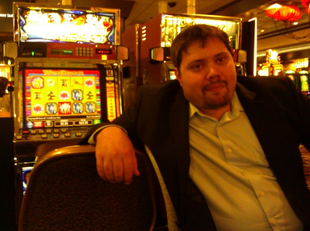 A portly bearded man poses in front of a slot machine.