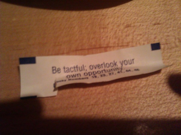 This is a fortune from a fortune cookie printed in blue ink on white paper that reads "Be tactful; overlook your own opportunity."
