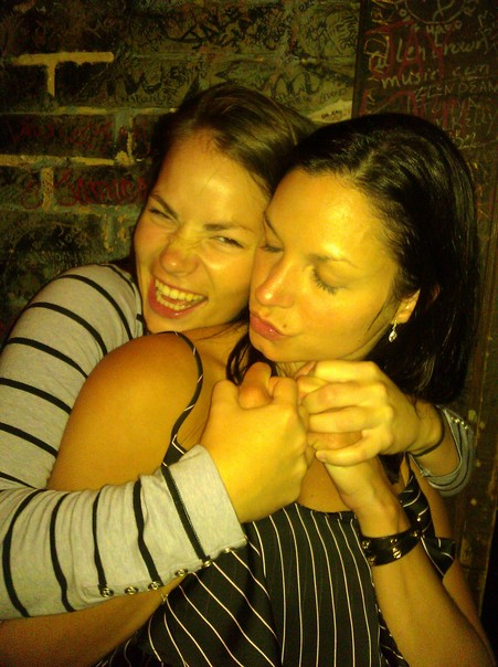 Two young women that are hugging one is smiling and the other one has her eyes closed.